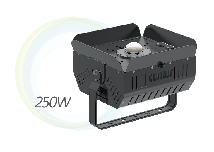 Kiểu mẫu nguồn áng LED COB Integrated kích thước đèn 430(L)x 415.5(W)x 358mm(H) phương thức lắp đặt U-Bar Wall-mounted điện áp vào AC100~240V, 50/60Hz công suất 250W±10% hiệu suất ánh sáng đèn 140 lm/w±5% thông lượng ánh sáng 35000 lm±5% nhiệt sắc 3000K±400K/ 4500K±500K/ 5500K±500K góc chùm 30° / 60° Symmetric Lens công suất >0.95 chỉ số diễn sắc >80Ra môi trường sử dụng thích hợp -20℃ ~ 50℃ đẳng cấp chống nước IP65 chống bụi, trọng lượng nguyên liệu. Anodized Aluminum, 15Kg